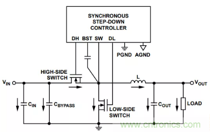 圖1所示為一個(gè)同步降壓調(diào)節(jié)器設(shè)計(jì),它包括一個(gè)開關(guān)控制器和以下外部電源器件:高端開關(guān)、低端開關(guān)、電感、輸入電容、輸出電容和旁路電容。圖1中的箭頭表示高開關(guān)電流流向。必須小心放置這些電源器件,避免產(chǎn)生不良的寄生電容和電感,導(dǎo)致過大噪聲、過沖、響鈴振蕩和接地反彈。