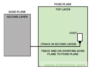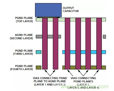 AGND層一路擴(kuò)展到輸出電容,AGND層和PGND層在輸出電容的負(fù)端連接到過孔。