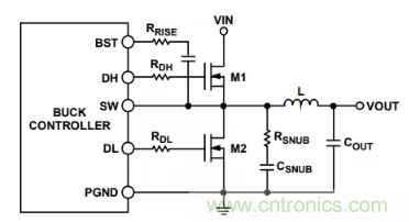 在DH或DL引腳上串聯(lián)一個(gè)小電阻(約2 Ω至4 Ω)可以減慢柵極驅(qū)動(dòng),從而也能降低柵極噪聲和過沖。另外,BST與SW 引腳之間也可以連接一個(gè)電阻(參見圖6)。在布局期間用0 Ω柵極電阻保留空間,可以提高日后進(jìn)行評估的靈活性。增加的柵極電阻會(huì)延長柵極電荷上升和下降時(shí)間,導(dǎo)致 MOSFET的開關(guān)功率損耗提高。