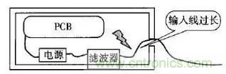 許多設備的電源線進入機箱后,經(jīng)過很長的導線才接到濾波器的輸入端。例如,電源線從機箱后面板輸入,走行到前面板的電源開關,又回到后面板接到濾波器。或者濾波器的安裝位置距離電源線入口較遠,造成引線太長(如圖1所示)。