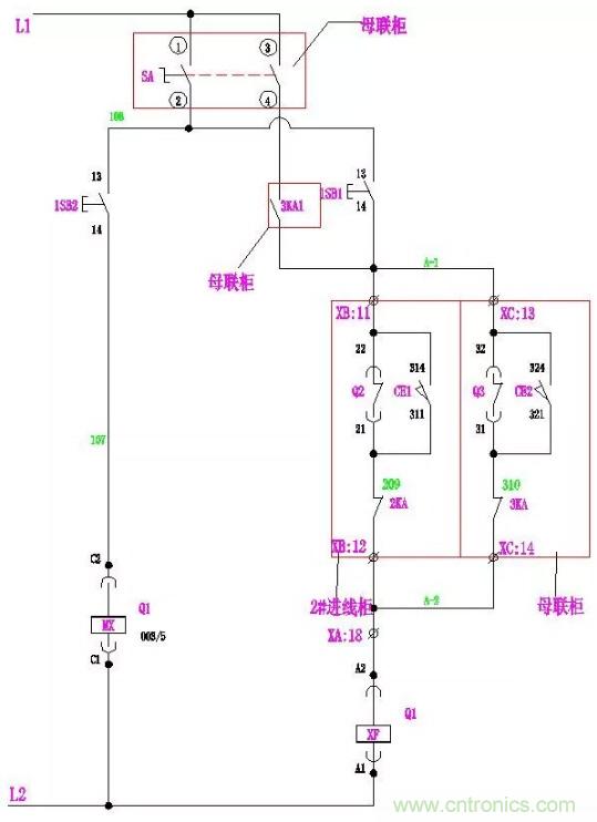 手動時:萬轉(zhuǎn)SA的1、2腳連通。當(dāng)Q2、Q3合閘,Q1合閘回路A-2、A-3斷開,其合閘線圈XF無法得電, Q1不能滿足合閘條件;同理,當(dāng)Q1、Q2或Q1、Q3同時合閘時,Q2或Q3也同樣不能滿足合閘條件。使進(jìn)線柜與母聯(lián)滿足“三合二”邏輯。