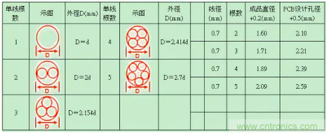 多根飛線直徑計(jì)算參考如下表格: