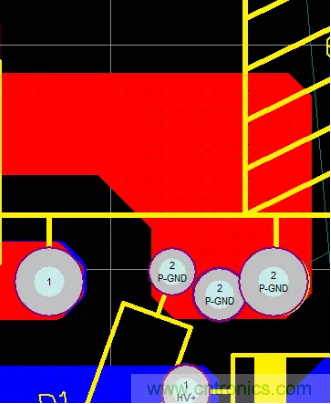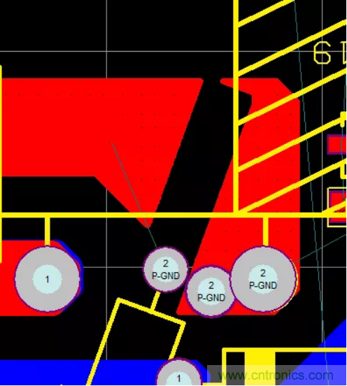 47.PCB的熱點(diǎn)區(qū)域一定要遠(yuǎn)離輸入、輸出端子,防止噪聲源串到線上導(dǎo)致EMI變差,在不得已而為之時(shí),可增加地線或其它屏蔽方式進(jìn)行隔離,如下圖增加了一條地線進(jìn)行有效隔離。