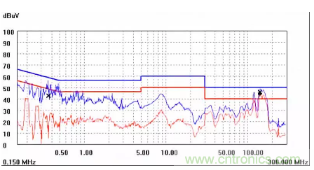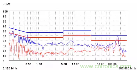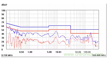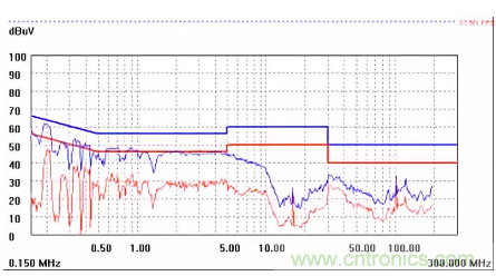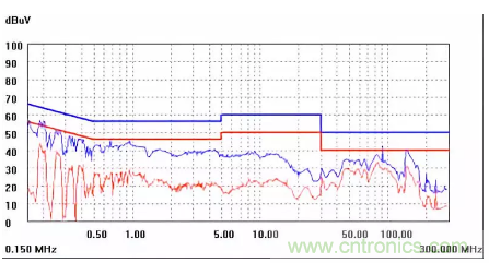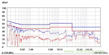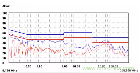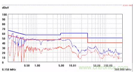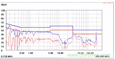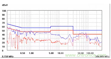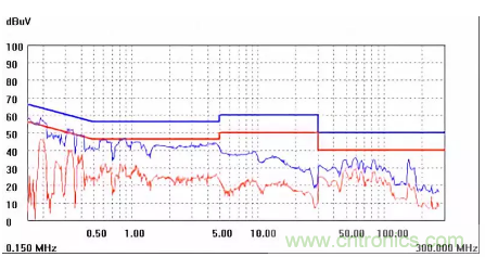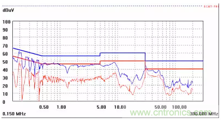 圖一a可以看出,改變PCB布局后130M-200M已經(jīng)完全被衰減,但是30-130M沒有圖一效果好,可能變壓器出線無(wú)交叉好一些。仔細(xì)觀察,此IC具有抖頻功能,傳導(dǎo)部分頻段削掉了一些尖峰;