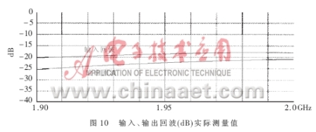 得到了完整的電路PCB板后,就要實(shí)際測量電路的各個(gè)參數(shù),驗(yàn)證設(shè)計(jì)的仿真結(jié)果是否與之相符,是否最終符合表1的設(shè)計(jì)技術(shù)規(guī)范。本文所采用的測試儀器是HP8753ES網(wǎng)絡(luò)分析儀和HP8970B噪聲儀。圖8、圖9表達(dá)出放大器實(shí)測的NF和增益曲線,在帶寬為0.1GHz的頻率范圍內(nèi)NF的值在0.8dB和1.0dB之間,增益在1.97GHz達(dá)到最大值15.5dB,在1.99GHz達(dá)到了15.3dB。由于NF是在實(shí)際PCB板外腔體內(nèi)測得的,包含了同軸連接器的損耗和二級(jí)噪聲損耗,其測量指標(biāo)表明實(shí)際的電路NF特性要稍差于模擬特性。圖10是輸入、輸出的回波曲線。當(dāng)頻點(diǎn)在1.96GHz時(shí),輸入回波為18dB,輸出回波達(dá)到22.5dB,放大器的OIP3在直流偏置Vds=3V,Id=60mA時(shí)測得值為37dBm,P1dB為21.4dBm。電路在較低的偏置狀態(tài)下Vds=3V,Id=40mA放大器的NF和增益都沒有降低,只有OIP3測出下降為36.5dBm。
