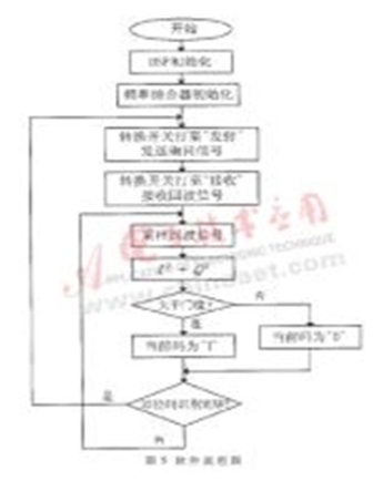 軟件流程如圖5所示。系統(tǒng)開始工作后,DSP初始化,F(xiàn)PGA配置頻率綜合器ADF4127L,產(chǎn)生精準的頻率源。詢問機轉換開關指向發(fā)射位置,發(fā)射單元發(fā)射詢問脈沖信號,經(jīng)過一段時間后,開關指向接收位置,接收單元接收回波信號,先進行A/D采樣,并將I路和Q路的采樣值平方相加,若大于編碼門限,則判定當前碼為1,否則為0。一幀32位識別碼判別完后,詢問單元重新發(fā)出詢問信號,如此循環(huán)。解調出的識別碼通過串口送給外部設備,以供處理。