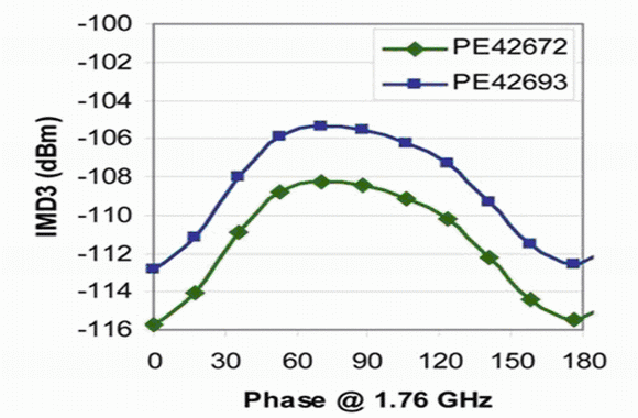 手機(jī)中增加的頻段越多,對開關(guān)的技術(shù)要求就越高,而且WCDMA的線性度和諧波要求對器件性能也帶來了很大的壓力。通過利用UltraCMOS制造工藝的線性優(yōu)勢,圖2中的單片PE42693 SP6T可以保持其前代SP7T開關(guān)+68dBm的IP3,而且IMD3性能超過業(yè)界標(biāo)準(zhǔn)的-105dBm(圖1)。