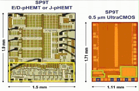 隨著多頻段手機(jī)越來越流行,對高集成度、小型天線開關(guān)的需求也越來越迫切。UltraCMOS SP7T開關(guān)現(xiàn)在已經(jīng)開始批量生產(chǎn),SP9T也在2007年底投入批量生產(chǎn)。在外形方面,GaAs SP7T為1.6x1.5mm,而采用SOS工藝SP7T開關(guān)只有1.2x1.0mm,面積縮小了一半。目前的GaAs E/D pHemt或J-pHemt SP9T開關(guān)外形尺寸為1.9x1.5mm。與之相比,采用UltraCMOS 0.5μm工藝制造的SP9T外形尺寸為1.7x1.1mm(圖3),它不需要片外ESD器件和性能增強(qiáng)匹配器件。UltraCMOS發(fā)展規(guī)劃預(yù)計(jì)0.25μm版本的SP9T尺寸將達(dá)到1.32x1.29mm。