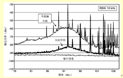 最后,要注意人體對(duì)小天線在FM調(diào)頻頻帶的增益的影響是正面的,尤其是使用者的身體與天線或者底板接觸的情況下。這是因?yàn)?,?00MHz左右,人體是效率相當(dāng)好的天線,半波長(zhǎng)是1.5m左右。圖3給出了人體接觸天線和沒(méi)有接觸天線時(shí),接收天線的輸出頻譜。很明顯,用手接觸天線時(shí),G/T提高了10~15dB。由于大多數(shù)使用者在聽(tīng)電話時(shí)和移動(dòng)電話是靠得很近的,所以可以合理地假定,F(xiàn)M調(diào)頻天線的實(shí)際性能優(yōu)于它處在自由空間時(shí)的性能。