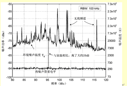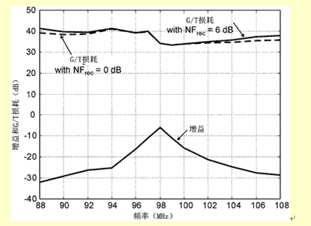 由現(xiàn)場(chǎng)測(cè)試可知,在接收FM調(diào)頻信號(hào)時(shí),ActivvTM有源天線的性能相當(dāng)于耳機(jī)連接線型天線,雖然這兩種天線的尺寸有很大差別??紤]到有源天線的體積小,它的幅射電阻大約只有1mΩ,而寄生損失電阻至少有1Ω左右,增益在-30~-50dBi的范圍內(nèi)。對(duì)于大多數(shù)RF工程師來(lái)講,這樣的增益是很難接受的。但是有一個(gè)因素極大地放寬了接收FM調(diào)頻信號(hào)時(shí)對(duì)增益的要求,即很高的環(huán)境噪聲溫度。圖8是一個(gè)消聲室(為了得到保守的估計(jì))在屏蔽裝置拿走后的噪聲電平。大多數(shù)無(wú)線系統(tǒng)工作在頻率高于1GHz的范圍,環(huán)境噪聲接近室溫,增益為-10dBi,相當(dāng)于信噪比降低了10dB,在FM頻段內(nèi),在城市的大部分地區(qū),由于人為噪聲的影響,噪聲電平高了大約20dB(對(duì)于調(diào)幅會(huì)更高)。因此,與完美的雙極電線相比,效率差的天線收到的信號(hào)較弱,噪聲較小。圖9給出了增益不同(0、-20、-40dB)的三種天線不同噪聲溫度時(shí)的G/T值。所有三種天線都接到噪聲指數(shù)為6dB的接收器上。對(duì)于增益為-40dB的實(shí)際天線(在室溫下G/T值減少46dB),當(dāng)情況相同時(shí),在23.000K的典型溫度下性能提高了19dB。對(duì)于有源天線,通過(guò)壓制接收器的噪聲指數(shù),可以把性能再提高6dB。所以,從信噪比方面看,增益為 -40dB的無(wú)源天線,只比完美的雙極天線差27dB。