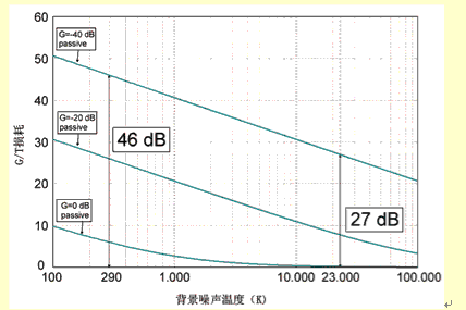 在實(shí)際應(yīng)用中,除了受天線特性的影響,有兩個(gè)外來(lái)的因素會(huì)影響G/T損失的數(shù)值:接收器的噪聲指數(shù)和環(huán)境噪聲溫度Ta。接收器的噪聲指數(shù)會(huì)增大天線的輸出噪聲Tout(因而降低G/T),環(huán)境噪聲溫度也會(huì)增大輸出噪聲。