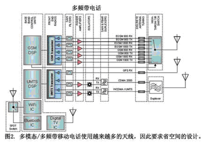 很早就在向各個方向發(fā)送信號的固定系統(tǒng)中觀察到干擾,例如WiFi,當具有同樣能量和頻率的兩個發(fā)送器相互靠攏時就會產(chǎn)生干擾。通常采用時間分配、定向發(fā)送、多樣化和/或跳頻來解決這個問題。但移動電話的設(shè)計遠沒有這樣高的靈活性,這是因為器件的移動性和存在不可預(yù)測的其它干擾源,比如移動電話、局域網(wǎng)和藍牙等,以及小尺寸的移動電話和高接收靈敏度的要求。使用超高Q過濾(SAW、FBAR和/或空腔)來保護接收器免受干擾,并且清理發(fā)送以盡可能地降低產(chǎn)生干擾的可能性。不幸的是,這要求每個工作模式/頻段都至少有一對額外的固定濾波器,這會增大移動電話的成本和尺寸。這些濾波器所要過濾的信號可能來自于同一平臺的其它天線,但是鄰近的天線之間可能產(chǎn)生相互干擾(圖3)。密集的天線可能會引起天線到天線的直接耦合,這就需要更嚴格的濾波器規(guī)范,從而使濾波器的復(fù)雜度和成本上升。如果天線與RF路徑耦合,那么固定濾波器可能很難起作用,因為濾波器是無法與RF路徑隔離的,但是PCB屏蔽層有助于將這種耦合效應(yīng)降到最低。