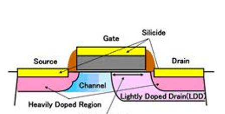 1.“低摻雜漏極”(LDD)區(qū)包圍該晶體管的漏極,并與門極重疊。這一結(jié)構(gòu)既能降低水平擴(kuò)展至漏極的電場(chǎng),也能降低垂直擴(kuò)展至門極氧氣層的電場(chǎng),從而增加了擊穿電壓。