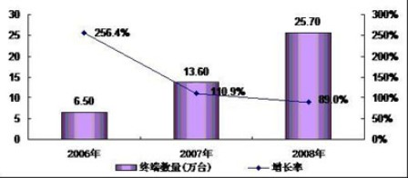 圖1 2006-2008年中國車載公交移動(dòng)電視終端發(fā)展及增長率