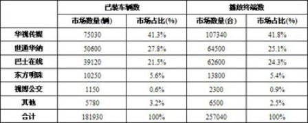 2008年,中國車載公交視聽系統(tǒng)市場品牌競爭格局中,華視傳媒憑借其強(qiáng)大的采用數(shù)字移動(dòng)電視技術(shù)的聯(lián)播網(wǎng)以及其靈活獨(dú)特的合作模式,成為中國車載公交視聽系統(tǒng)市場已裝車輛和播放終端兩大指標(biāo)的市場第一,緊隨其后的是世通華納和巴士在線,東方明珠由于主要局限于上海市場,市場排名為第四。作為地方的車載視聽系統(tǒng)運(yùn)營商視博公交,則完全局限于杭州本土市場發(fā)展。DMG集團(tuán)公司,由于更加集中于地鐵視頻廣告的運(yùn)營和推廣,在全國的整體實(shí)力上,還不足以顛覆目前的格局。