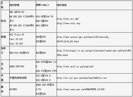 SRD無線系統(tǒng)的設(shè)計(jì)者在選擇無線通信頻率上需要格外小心。在大多數(shù)的情況下,此選擇被侷限于頻譜中容許免執(zhí)照使用的那些部份,而前提是必須符合使用上的特定規(guī)格與條件。表一所列為全球可使用的頻帶。