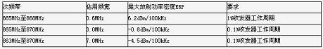 如表三所示,為使用FHSS時(shí),歐洲的擴(kuò)展頻帶上(低于870MHz)所需要的頻道數(shù)量、有效發(fā)射功率(ERP)、及工作週期。當(dāng)符合"說前先聽(listen-before-talk,LBT)"或是工作週期有效率限制值時(shí),便可有高達(dá)7MHz的頻寬可供使用,以往則只有2MHz的范圍。