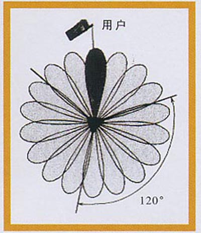 (1)波束轉(zhuǎn)換智能天線波束轉(zhuǎn)換智能天線具有有限數(shù)目的、固定的、預(yù)定義的方向圖,它利用多個(gè)并行窄波束(15°~30°水平波束寬度)覆蓋整個(gè)用戶區(qū),每個(gè)波束的指向是固定的,波束寬度也隨天線元的數(shù)目而確定(見圖2)。波束轉(zhuǎn)換系統(tǒng)實(shí)現(xiàn)比較經(jīng)濟(jì),與自適應(yīng)天線相比結(jié)構(gòu)簡單,無需迭代,響應(yīng)快、魯棒性好。但預(yù)先設(shè)計(jì)好的工作模式有限,窄波束的特性將極大地影響系統(tǒng)性能。