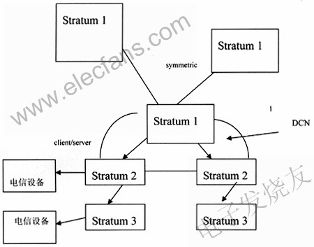 本地網(wǎng)級的Stratum1時間服務(wù)器之間互相聯(lián)網(wǎng),以symmetric方式互相校時,避免GPS時間源出故障造成中斷,還可以達到更高精度。Stratum1時間服務(wù)器對下級采用client/server方式。Stratum1時間服務(wù)器取得GPS時間信號和其他授時方式時間信號,比如其他導(dǎo)航衛(wèi)星,短波,長波方式,互為備用。上下級Stratum采用DCN相連或?qū)>€相連,保持穩(wěn)定相連。各級時間服務(wù)器把時間信號發(fā)到各個通信設(shè)備,如圖3所示。