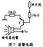 顯示電路采用4位共陽LED數(shù)碼管,碼段由74LS244驅動電路驅動;驅動電路由PNP晶體管8550驅動。圖7給出報警電路。它采用晶體管驅動。