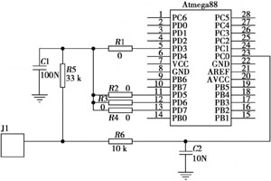 對(duì)微控制器芯片選擇Atmel ATmega88,因?yàn)樗哂械凸模€有待機(jī)模式和主動(dòng)模式的快速轉(zhuǎn)換功能,所以無線傳感器能夠在非常短的時(shí)間完成數(shù)據(jù)的測(cè)量和傳輸;它有一個(gè)內(nèi)置的掉電檢測(cè)電路,可用來提醒用戶傳感器網(wǎng)絡(luò)電池是否需要更換;它還有一個(gè)內(nèi)置的A/D轉(zhuǎn)換器,可以將傳感器的模擬信號(hào)轉(zhuǎn)換成具有10位數(shù)字值的數(shù)字信號(hào)(零代表0V,210-1代表電源電壓和最大可能電壓)。