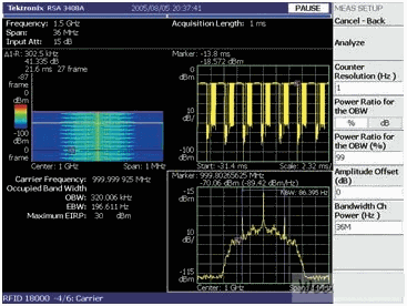 政府規(guī)定要求控制發(fā)射信號的功率、頻率、帶寬。這些規(guī)定防止有害干擾并保證每個發(fā)射者都是頻帶內其他用戶的友好鄰居。對于許多頻譜分析儀特別是通常用于脈沖信號能量測量的掃頻頻譜分析儀,進行此類測量是具有挑戰(zhàn)性的。RTSA 能夠分析一個完整的分組發(fā)射過程的能量特點,也能直接測量跳頻信號的載波頻率,而無需將信號置于一個跨度的中心。按一下按鍵,分析儀就能識別一個瞬時 RFID 信號的調制方式并能夠對功率、頻率和帶寬進行監(jiān)管測量,使預一致性(pre-compliance)測試過程變得非常靈活和方便 [參閱圖2]。預一致性測試有助于確保產品一次通過一致性測試,而無需重新設計和重新測試。