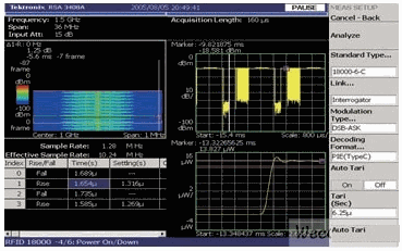 預編程測量能減少進行這些測試所需的建立時間。例如,ISO18000-6 C 類型的一個重要測量是啟動時間和關閉時間。載波能量上升時間必須足夠快以保證標簽采集到使其正常工作的充足能量。信號也必須迅速達到穩(wěn)定狀態(tài)。發(fā)射結束時,載波能量下降時間必須足夠快,以防止其他發(fā)射受到干擾 [參閱圖3]。