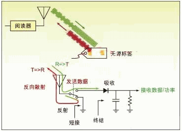 圖1:無源標簽對射頻 RF能量進行整流并調制信號,然后反向散射反射給閱讀器。