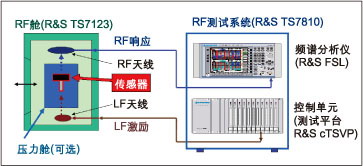 壓力艙模擬RF測試艙內(nèi)部的胎壓。一個波形發(fā)生器以125kHz LF數(shù)據(jù)電報激勵胎壓傳感器發(fā)送數(shù)據(jù)(ID號碼、壓力和溫度)。該RF數(shù)據(jù)電報由測試艙中的ISM天線拾取并在頻譜分析儀中解調(diào)。其系統(tǒng)軟件可評估該信息并給出GO/NoGo信息。