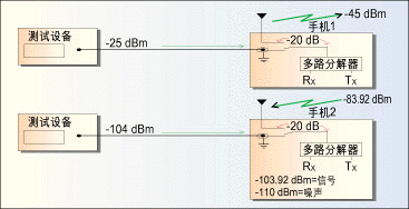 多數(shù)情況下,手機(jī)會(huì)因屏蔽很差的RF電纜或未連接的天線端口很容易受到噪聲影響。一般來(lái)講天線端口是噪聲的主要來(lái)源,特別是如果天線是在測(cè)試時(shí)才接上。圖3表示正在進(jìn)行靈敏度試驗(yàn)的手機(jī)對(duì)另一個(gè)正向鏈路功率-25dBm手機(jī)可能產(chǎn)生的影響情況,手機(jī)1是正在進(jìn)行測(cè)試的手機(jī),具有較高的-25dBm正向鏈路功率。由于手機(jī)1發(fā)射信道功率為-25dBm,假設(shè)未連接開(kāi)關(guān)的衰減是20dB,那么通過(guò)天線未連接端口泄露出的信號(hào)可能高達(dá)-45dBm。