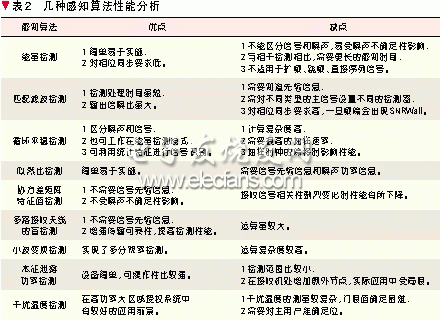 以上這些算法都是對(duì)主用戶(hù)發(fā)射端信號(hào)的直接檢測(cè),基本都是從經(jīng)典的信號(hào)檢測(cè)理論中移植過(guò)來(lái)的。此外,近期一些文獻(xiàn)從主用戶(hù)接收端的角度提出了本振泄露功率檢測(cè)和基于干擾溫度的檢測(cè)。有些文獻(xiàn)對(duì)經(jīng)典算法進(jìn)行了改進(jìn),如文獻(xiàn)[2]提出了一種基于能量檢測(cè)-循環(huán)特征檢測(cè)結(jié)合的兩級(jí)感知算法。文獻(xiàn)[3]研究了基于頻偏補(bǔ)償?shù)钠ヅ錇V波器檢測(cè)、聯(lián)合前向和參數(shù)匹配的能量檢測(cè)、多分辨率頻譜檢測(cè)和基于小波變換頻譜檢測(cè)等。表2歸納了文獻(xiàn)中提及較多的一些感知算法,并對(duì)其優(yōu)缺點(diǎn)進(jìn)行了比較。