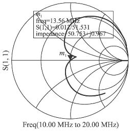 手動調(diào)諧即是交替不斷調(diào)整電容C1、C2 的值,同時觀察曲線變化,直到在所要求的頻率點S11等于0。圖2為某一天線電路在頻率在10~20MHz之間變化時,其反射系數(shù)的變化曲線,其中,標(biāo)記13. 56MHz的點, S11值近似為0,達到了匹配要求。