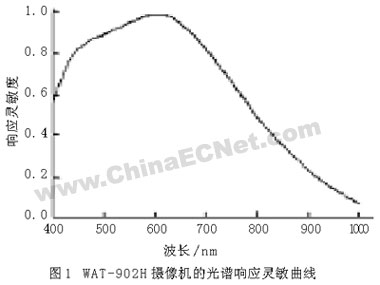 獲得的圖像質(zhì)量直接影響圖像處理程序的復(fù)雜度和檢測結(jié)果。如果采用的光源單色性越好,越接近平行光,則圖片的干涉條紋更清晰,質(zhì)量更好。然而單色激光器或者平行光源體積大,而紅外測試系統(tǒng)的一大特點(diǎn)就是結(jié)構(gòu)簡單、緊湊,而提供窄波段的照明價(jià)格比較昂貴,且不易控制,因此選用普通的白熾燈作為光源。為了得到較好的紅外圖片,在鏡頭的上方放置一塊雙面鏡面拋光的硅片,從而過濾掉可見光對圖片的影響。同時(shí),選用超低照度黑白攝像機(jī)WAT-902H,它的光譜響應(yīng)靈敏曲線如圖1所示。而紅外線波長為750 nm~1000μm,這樣我們采用普通的光源就可以獲得窄波段的紅外圖像。另外,由于該相機(jī)對紅外波段的響應(yīng)靈敏度不高,可以通過增加光強(qiáng)來克服,從而獲得清晰的紅外干涉圖像,為后續(xù)的圖像分析和處理做準(zhǔn)備。