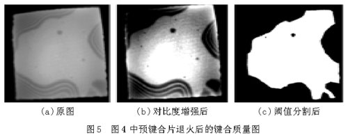 將上節(jié)中預(yù)鍵合的硅片在120。C下退火5 h,最終得到鍵合片的紅外圖片如圖5(a),其鍵合質(zhì)量如圖5,鍵合率為60.20%。