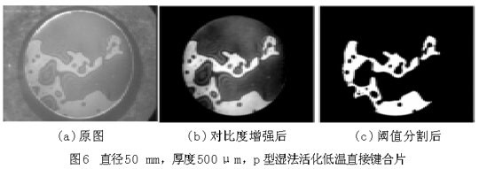 圖6(a)和圖7(a)中,圓形區(qū)域是要鍵合的圓片,其中明區(qū)為鍵合上的地方,暗區(qū)為未鍵合上的地方,圓形區(qū)域(即鍵合圓片)以外為圖像背景。從圖上可以大致地看出空洞(未鍵合區(qū)域)的分布、個(gè)數(shù)和大小等。為了獲得更為準(zhǔn)確的數(shù)據(jù)信息,借助圖像處理程序?qū)D片(a)進(jìn)行對比度增強(qiáng)、平滑、分割等一系列處理,可獲得圖(b),(c),從而得到鍵合率。樣品1的鍵合率為28.12%,鍵合率很低,并且從圖6中空洞的分布可以看出,樣品1鍵合得很不好。樣品2的鍵合率為66.12%。比較圖6和圖7,樣品2的鍵合質(zhì)量明顯優(yōu)于樣品1,可以說明鍵合圓片越薄,越容易鍵合。可以從平板理論理解這一鍵合現(xiàn)象,圓片越薄,界面表面能克服圓片翹曲貼合到一起所需要的力越小。