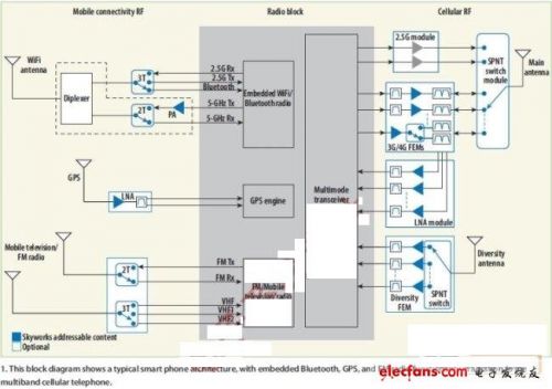 圖1:該模塊圖顯示了典型的智能手機架構,除了多頻段蜂窩電話外,還包含嵌入式藍牙、GPS和調頻收音機功能。