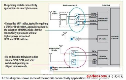 移動無線連接選件一般有兩種實現(xiàn)方式:使用分立元件和芯片組進行設計,或通過第三方模塊制造商提供。不管實現(xiàn)細節(jié)如何,在智能手機的移動連接側存在射頻開關的多種應用。