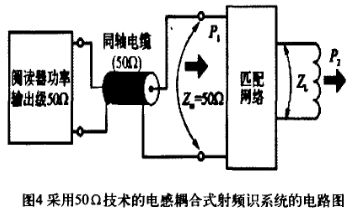 本文研究的RFID讀寫器頻率為13.56 MHz,為有效抑制功率反射、寄生輻射等高頻效應(yīng),通常是將讀寫器天線通過同軸電纜連接到讀寫器的高頻模塊,同軸電纜阻抗為50 Ω。因此,天線的阻抗匹配就是通過一定的無源匹配電路來改變讀寫器天線的輸入阻抗,使其與同軸電纜的阻抗保持一致,這樣就可使能量通過同軸電纜幾乎無損失的從讀寫器傳送出去。圖4為采用50 Ω技術(shù)的電感耦合式射頻識別系統(tǒng)電路。