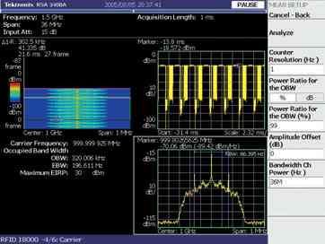政府規(guī)定要求控制發(fā)射信號的功率、頻率、帶寬。這些規(guī)定防止有害干擾并保證每個(gè)發(fā)射者都是頻帶內(nèi)其他用戶的友好鄰居。對于許多頻譜分析儀特別是通常用于脈沖信號能量測量的掃頻頻譜分析儀,進(jìn)行此類測量是具有挑戰(zhàn)性的。RTSA 能夠分析一個(gè)完整的分組發(fā)射過程的能量特點(diǎn),也能直接測量跳頻信號的載波頻率,而無需將信號置于一個(gè)跨度的中心。按一下按鍵,分析儀就能識別一個(gè)瞬時(shí) RFID 信號的調(diào)制方式并能夠?qū)β?、頻率和帶寬進(jìn)行監(jiān)管測量,使預(yù)一致性(pre-compliance)測試過程變得非常靈活和方便 [參閱圖2]。預(yù)一致性測試有助于確保產(chǎn)品一次通過一致性測試,而無需重新設(shè)計(jì)和重新測試。