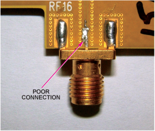 其次需要考慮PCB的裝配連接器與PCB傳輸線路之間的結(jié)點至關(guān)重要,因此連接器的焊接會對過渡產(chǎn)生重大影響。連接不良或未對齊的連接器會破壞電感和電容之間的微妙平衡,從而影響結(jié)點的阻抗。圖5是一個焊接不良的連接器結(jié)點示例。