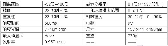 紅外測溫儀是通過接收目標(biāo)物體發(fā)射、反射和傳導(dǎo)的能量來測量其表面溫度。測溫儀內(nèi)的探測元件將采集的能量信息輸送到微處理器中進行處理,然后轉(zhuǎn)換成溫度讀數(shù)顯示。在帶激光瞄準(zhǔn)器的型號中,激光瞄準(zhǔn)器只做瞄準(zhǔn)使用。其性能說明下表。