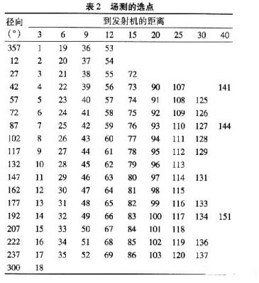 覆蓋測(cè)試是根據(jù)特定的半徑和幅角在圓周上進(jìn)行選點(diǎn)的,這些測(cè)試點(diǎn)的選擇總共包含18個(gè)不同幅角(12,27,42,58,72,87,102,117,132,147,162,177,182,207,222,287,300,357),對(duì)應(yīng)于以發(fā)射機(jī)為圓心的3,6,9,12,15,20,25,30和40 km這幾個(gè)半徑上。選點(diǎn)是出于幅角的考慮,展現(xiàn)了至少45 dBμV/m內(nèi)的場(chǎng)強(qiáng)估計(jì),并根據(jù)地形信息通過(guò)算法得到有用信息。圖2展示了場(chǎng)測(cè)選點(diǎn)的地形分配,測(cè)試點(diǎn)的具體參數(shù),如表2所示。