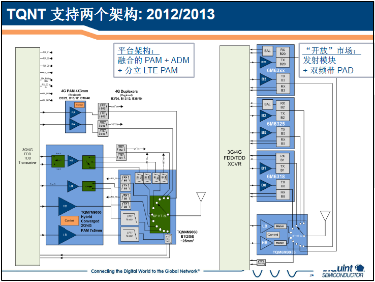 對(duì)于多頻多模的3G/4G手機(jī),針對(duì)射頻前端器件的設(shè)計(jì)如何實(shí)現(xiàn)集成?熊挺表示,目前有兩種方案:一種是融合架構(gòu),將不同頻率的射頻功率放大器PA集成;另一種架構(gòu)則是沿信號(hào)鏈路的集成,即將PA與雙工器集成。兩種方案各有優(yōu)缺點(diǎn),適用于不同的手機(jī)。融合架構(gòu),PA的集成度高,對(duì)于3個(gè)以上頻帶巨有明顯的尺寸優(yōu)勢(shì),5-7個(gè)頻帶時(shí)還巨有明顯的成本優(yōu)勢(shì)。缺點(diǎn)是雖然PA集成了,但是雙工器仍是相當(dāng)復(fù)雜,并且PA集成時(shí)有開關(guān)損耗,性能會(huì)受影響。而對(duì)于后一種架構(gòu),性能更好,功放與雙功器集成可以提升電流特性。所以TriQuint可以提供兩種架構(gòu)的方案,大于6個(gè)頻段時(shí)(指3G和4G)采用融合架構(gòu),而小于四個(gè)頻段時(shí)采用PA與雙工器集成的方案PAD。