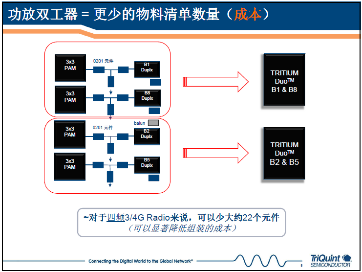 TriQuint中國區(qū)經(jīng)理熊挺介紹,一個(gè)更小、更靈活的解決方案可幫助工程師將更高質(zhì)量的產(chǎn)品以前所未有的更快速度推向市場。兩個(gè)TRITIUM DUO™模塊構(gòu)成的一個(gè)四頻解決方案尺寸僅為50平方毫米,是同等分立方案尺寸的一半,為3G/4G手機(jī)留下更多保貴的空間給其它應(yīng)用,比如增加更多功能或?qū)㈦姵刈龅酶?。并且,高度集成方案也簡化了設(shè)計(jì)。這款產(chǎn)品還將節(jié)省設(shè)計(jì)時(shí)間和資源。該產(chǎn)品具備的靈活性意味著生產(chǎn)速度會(huì)更快,需要的連接會(huì)更少,最終產(chǎn)生更高質(zhì)量的器件。