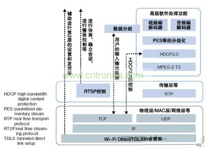 Wi-Fi Display是以無需經(jīng)由WLAN接入點即可在終端間直接通信的標準“Wi-Fi Direct”為基礎,由上層的協(xié)議棧軟件構(gòu)成的安裝指南。鎖定終端服務的“服務發(fā)現(xiàn)(Service Discovery)”等的處理利用Wi-Fi Direct進行,影像的壓縮/解壓處理及管理數(shù)據(jù)流的傳輸層等利用Wi-Fi Display處理(圖2)。壓縮/解壓采用H.264格式。由于最近的智能手機不但標配WLAN功能,采用內(nèi)置H.264編解碼器電路GPU的終端也很多,因此Wi-Fi Display還具有易于配備到終端中的特點。“在受限于安裝面積和耗電量的智能手機中,無需追加硬件即可配備的優(yōu)勢非常大”(Cavium公司的柴田)。