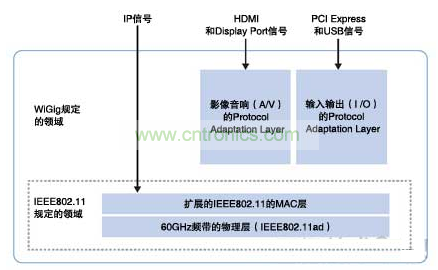WiGig雖然是最后出現(xiàn)的,但作為非壓縮方式的有力候補,其存在不容忽視。WiGig在60GHz頻帶的物理層及擴展了IEEE802.11的MAC層上,規(guī)定了處理HDMI和Display-Port等信號的擴展標準(圖4)。MAC層之所以與IEEE802.11標準確保了向后兼容,是因為設想了在平時使用WLAN,只在傳輸影像等時使用60GHz頻帶等用途。WiGig Alliance與Wi-Fi Alliance共同制定了認證計劃等,WiGig將來還有可能會與WLAN整合。