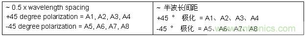 此例為一個 8 陣元物理天線,采用兩組天線單元配置。兩組天線單元彼此以 90? 正交交叉極化。天線組 0 包括天線單元 1 至 4,以 +45? 進行極化。天線組 1 包括天線單元 5 至 8,以 -45進行極化。