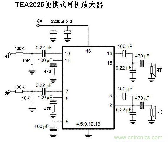 3,TEA2025使用手冊上推薦的線路,是作為小型功率放大器的應(yīng)用,電壓增益高達(dá)52分貝,不適合直接做耳放。我在它的第6,第11腳對地串入了470歐姆的電阻以降低增益。