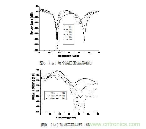圖6給出了該相控陣前六個激勵端口的仿真回波損耗和和前七個天線的相鄰單元的耦合系數(shù)曲線??梢钥闯觯鱾€端口匹配良好,且互耦隨著間隔的增大而較小。