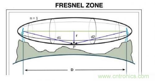 菲涅爾區(qū)是指無線電波離開天線后在可視距離周圍傳播的區(qū)域,如圖2所示。擁有視距對于保持強(qiáng)度有利,對于2.4GHz無線系統(tǒng)更是如此,原因在 于2.4GHz波易被水吸收。根據(jù)經(jīng)驗(yàn),必須有60%的菲涅爾區(qū)不存在障礙物。通常,20%的菲涅爾區(qū)被阻擋時幾乎不會引起鏈路信號損耗,而這一比例超過 40%時信號損耗將非常明顯。
